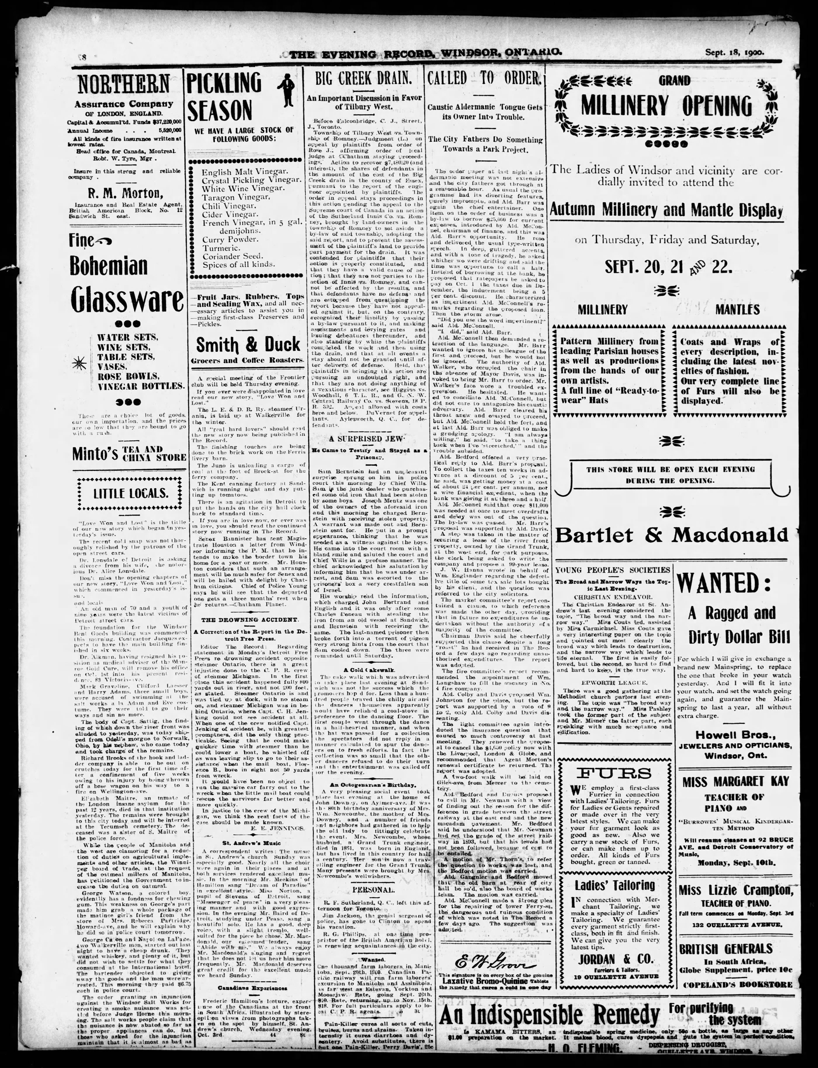 Here’s the whole newspaper page for context, but the item that would have been for Richard is in the middle. The output of the Linotype composing machine that the Windsor Star would have used in 1900 is garbled; in order, the affected lines in the second paragraph should read, “His worship read the information, which charged John Bertrand and Charles Deneau with stealing the iron from an old vessel at Sandwich, and Bernstein with receiving the same. The last-named prisoner then broke forth into a torrent of pigeon English and it was only after some very strong hints from the court that Sam cooled down.”
