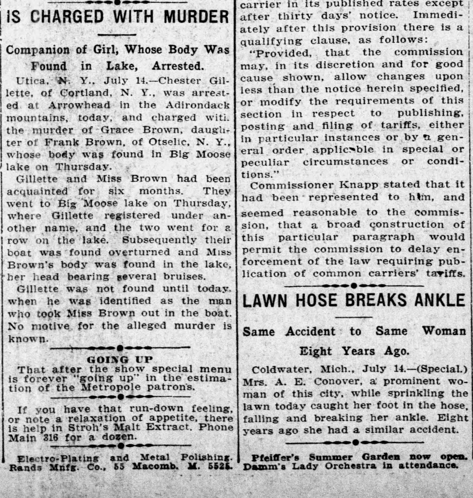 There below the fold they appear side by side: first an early text of the upstate New York drama of Chester Gillette; then, with no space whatever between, the text of a drama closer to Detroit. The Detroit text and only the Detroit text is tagged “(Special).” It also comes to us marked with a time term, “Eight years ago,” which points to the little did she know genre of dramatic irony. A mere six years after Chester’s boat capsized, the Titanic went down.