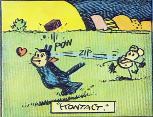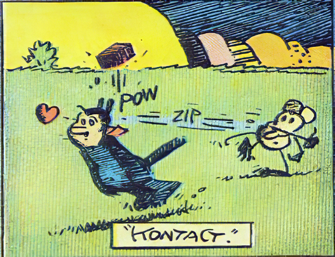 On a page, such a pairing of texts becomes one more text. Think of the infinitesimal between the liftoff of Ignatz’s brick (Zip) and its touchdown on Krazy’s head (Pow). Think of Ignatz and Krazy’s George Herriman as a geometer writing an equation that reveals that curve through time as one more thing: uniting the mouse, the brick, and the cat, their integrating idea.
