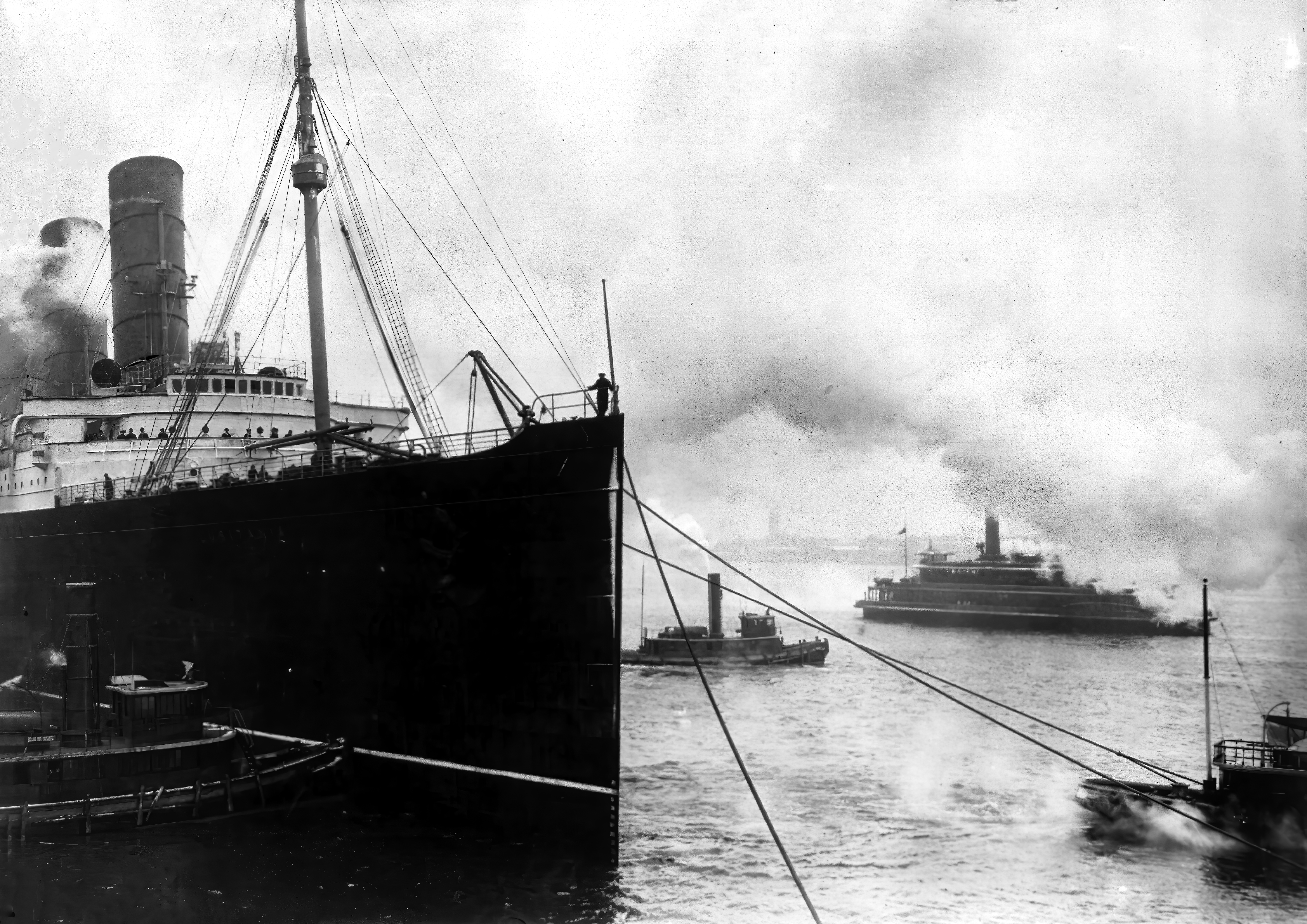 It docked two hours late, and the weather over the harbor was rainy and snowy. Nevertheless, a riverboat brought hundreds of people alongside, cheering. A photographer from the Bain News Service recorded their approach, and after that somebody scratched three words of explanation into the silent negative that survived the event. Using a photo-editing program, I’ve erased them from this print. Trying to read them on their own single term is pointless now, because “now” is the period of time extending almost all the way back to the instant of shutter release. To read the word “now” requires a supplementary history archived far from the site of anything instant.